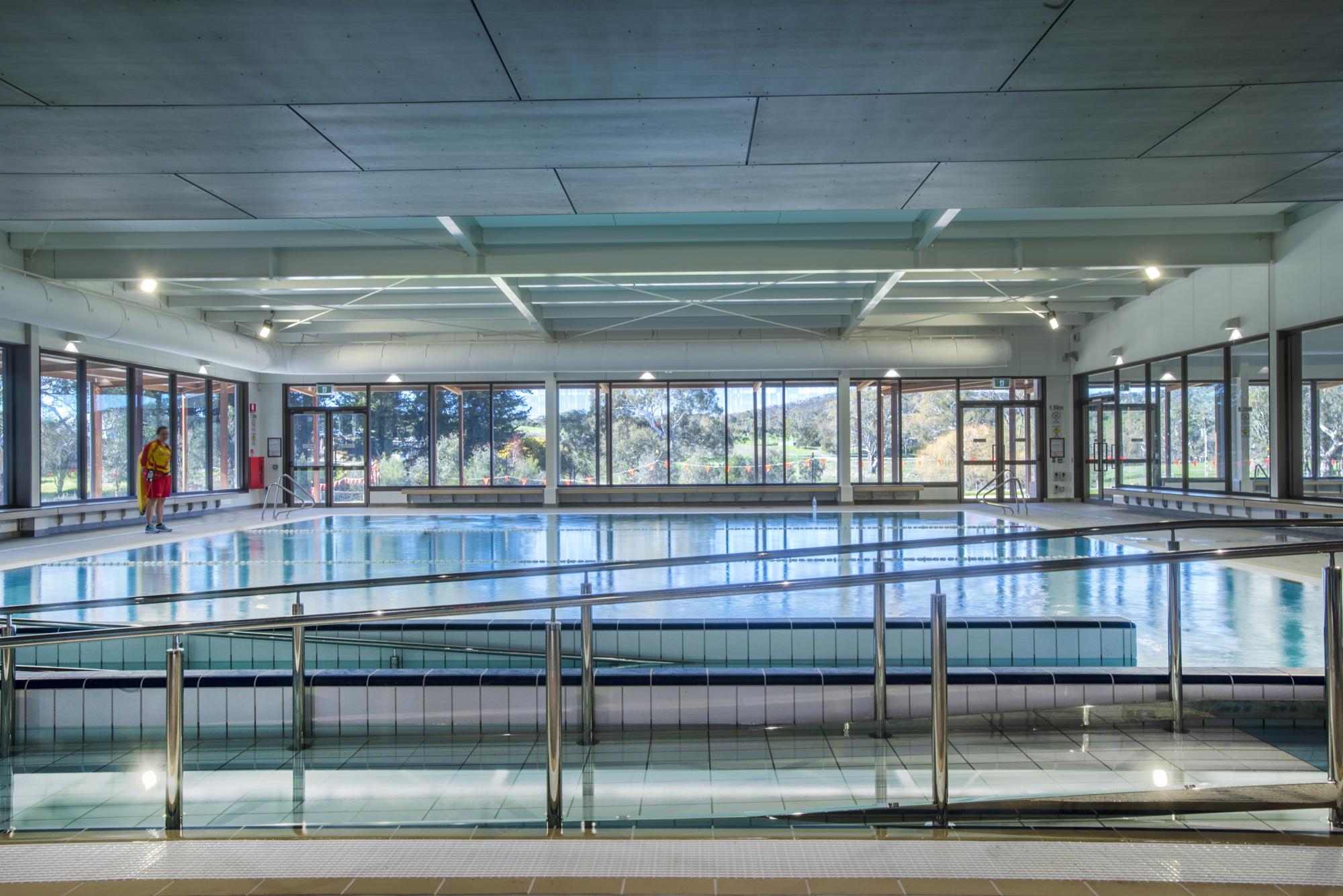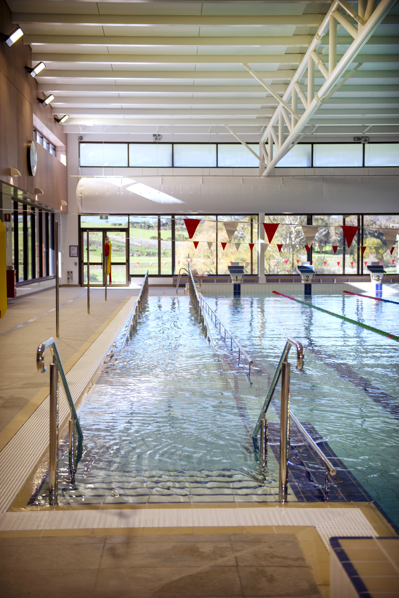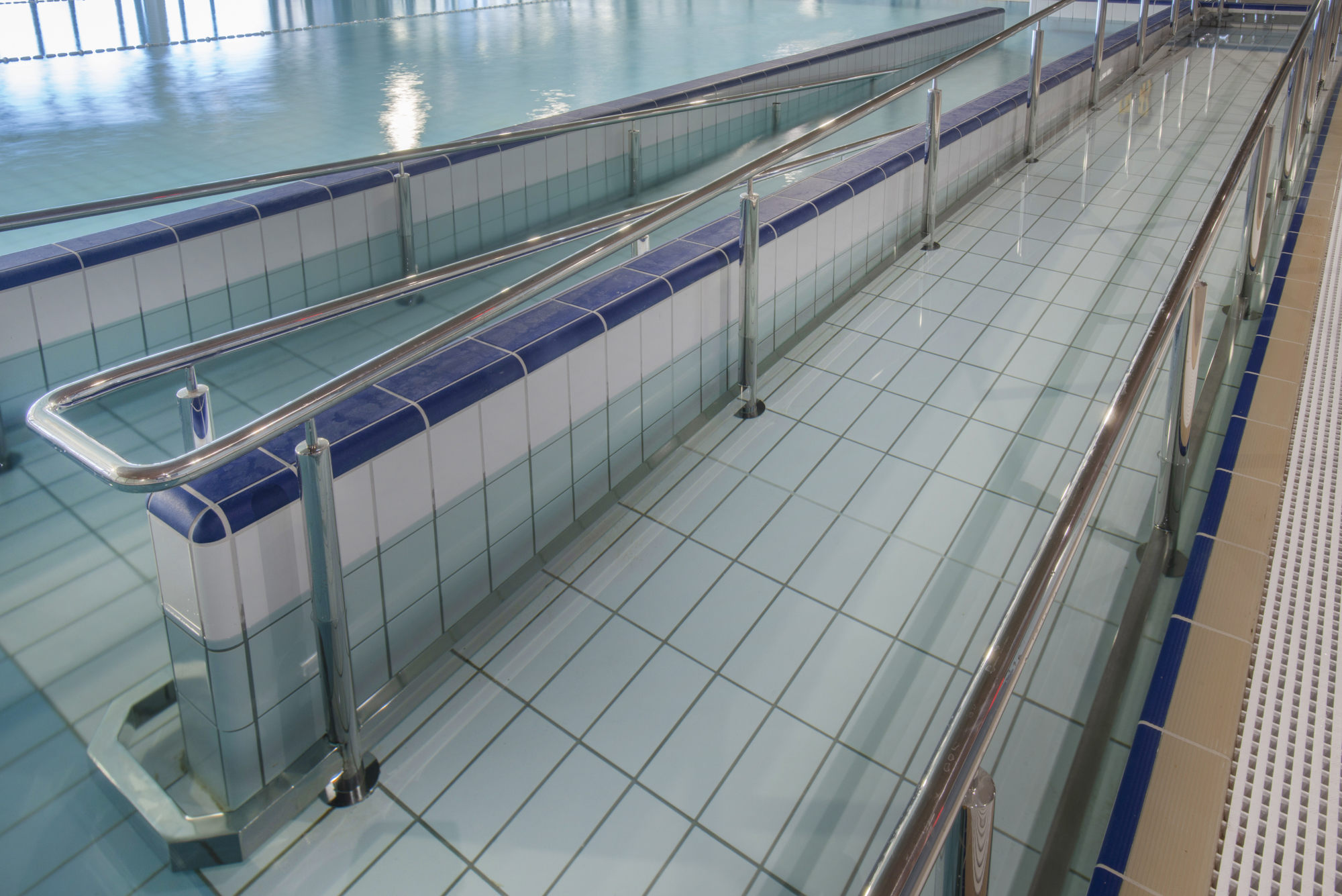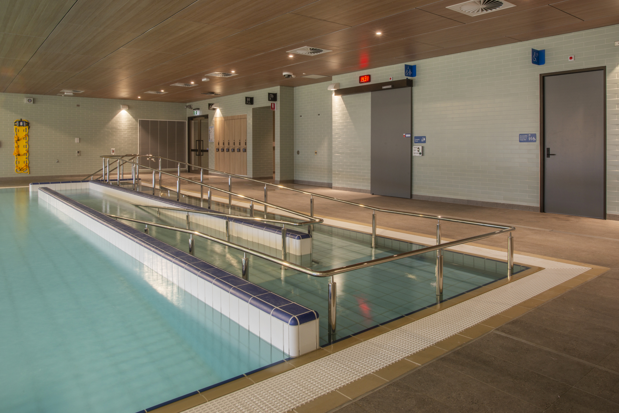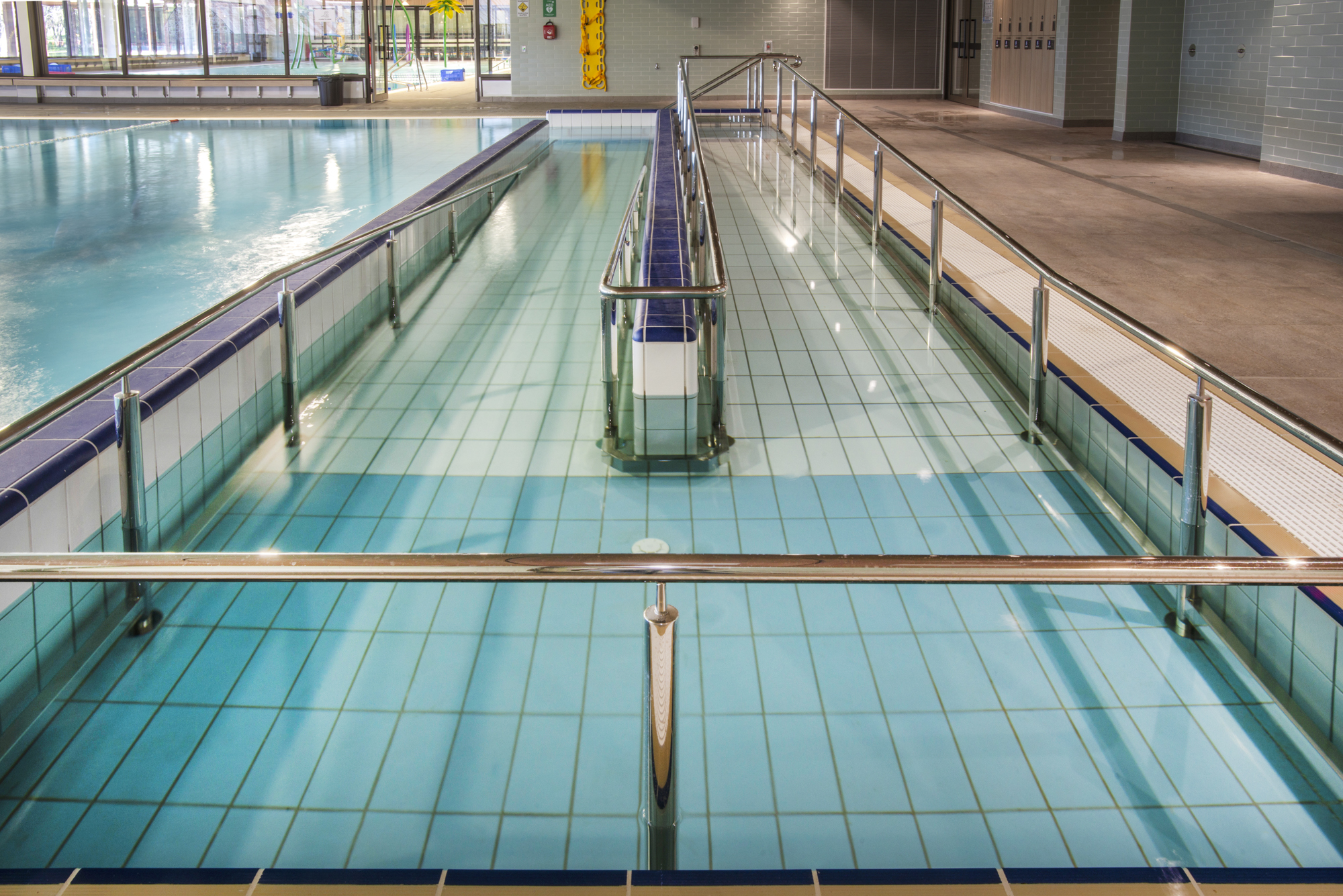 20m pool with beach area and wheelchair access ramp with stainless steel handrail.