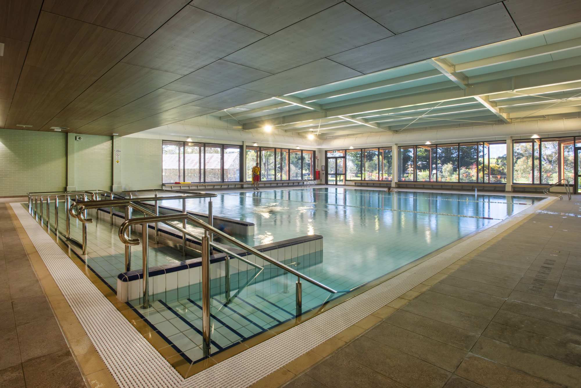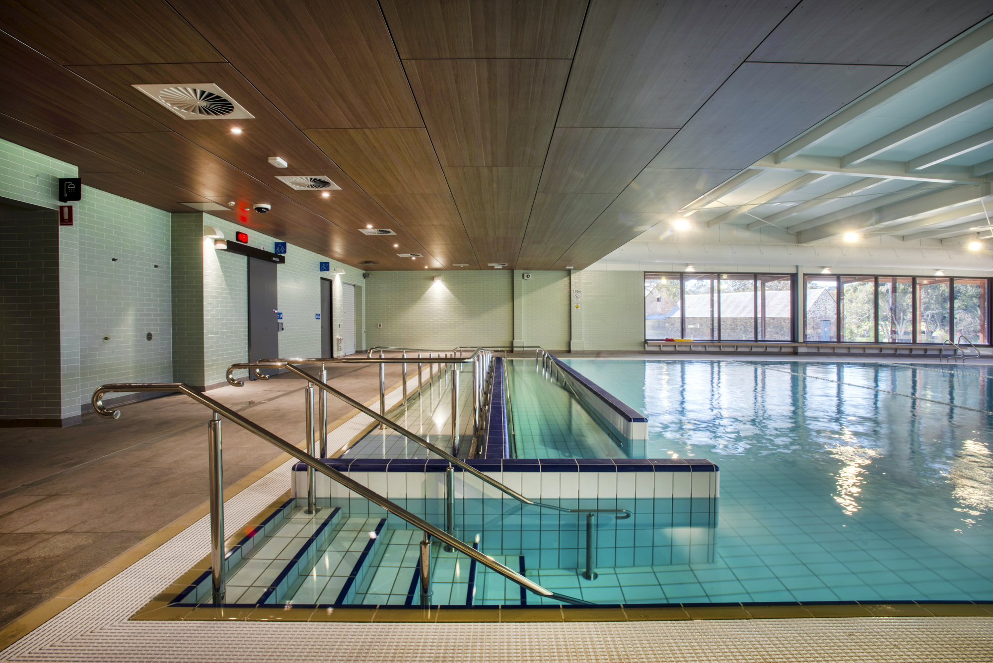 Fully tiled 25m x 12m with minimal slip surround, sand filtration, automatic liquid chlorine CO2 PH control, lane rope anchors and lane ropes, step insert and stainless steel grab rails and all signage to South Australian Health Commission regulations in plant room.
