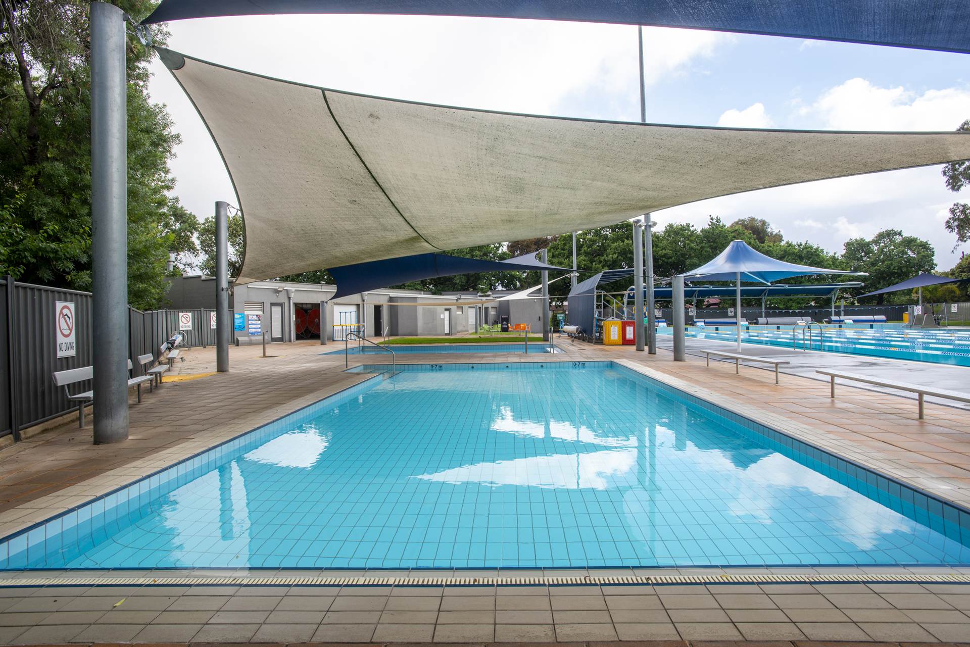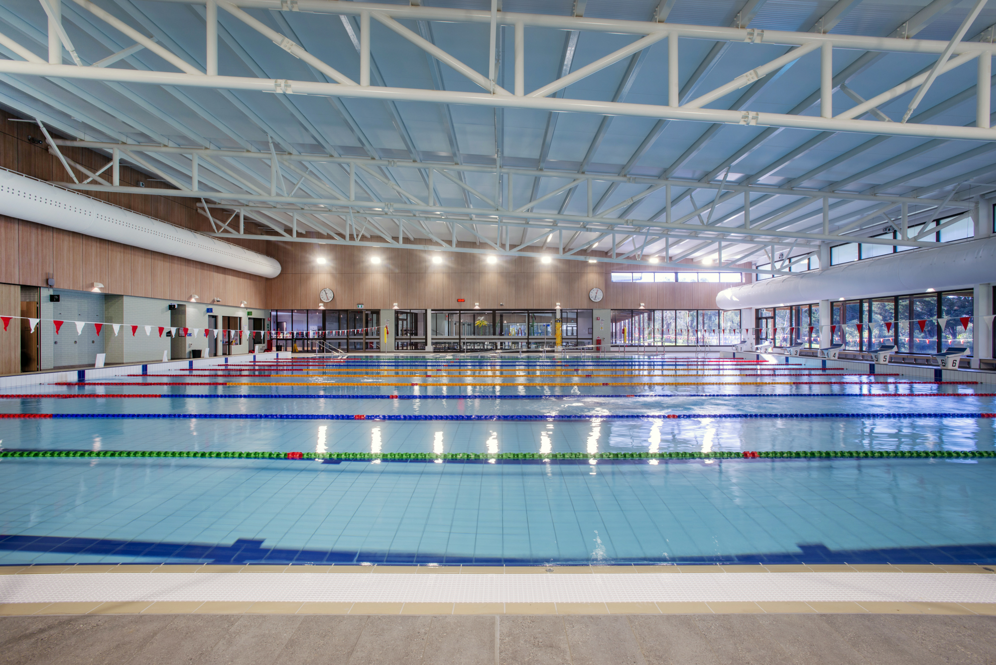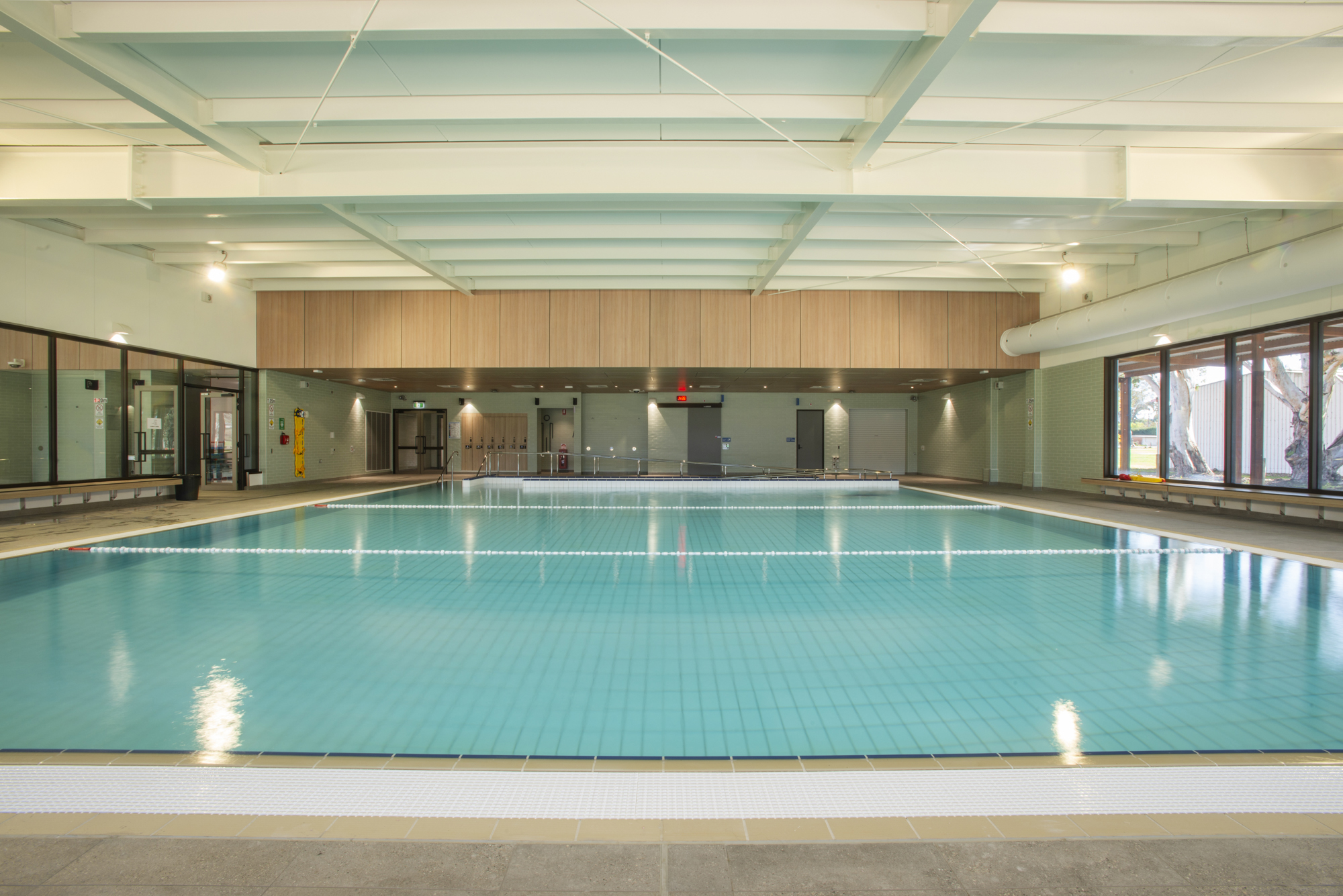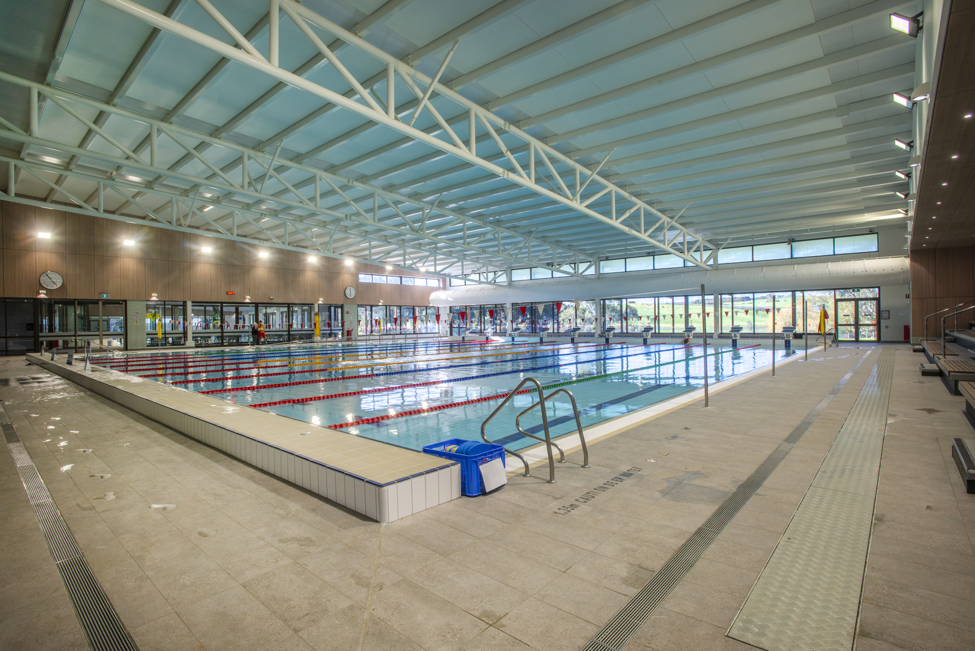 50m x 20m Olympic size pool, 2m to 1m depth, fully tiled using Agrob Buctile commercial tiles, wet edge with balance tank, lane rope anchors and lane ropes, lane rope reels, prominent chemical dosing system with CO2 liquid chlorine & liquid acid, sand filtration, 2 gas heaters, backwash tank, tiled internal steps with stainless steel rails and ll signage to South Australian Health Commission regulations.