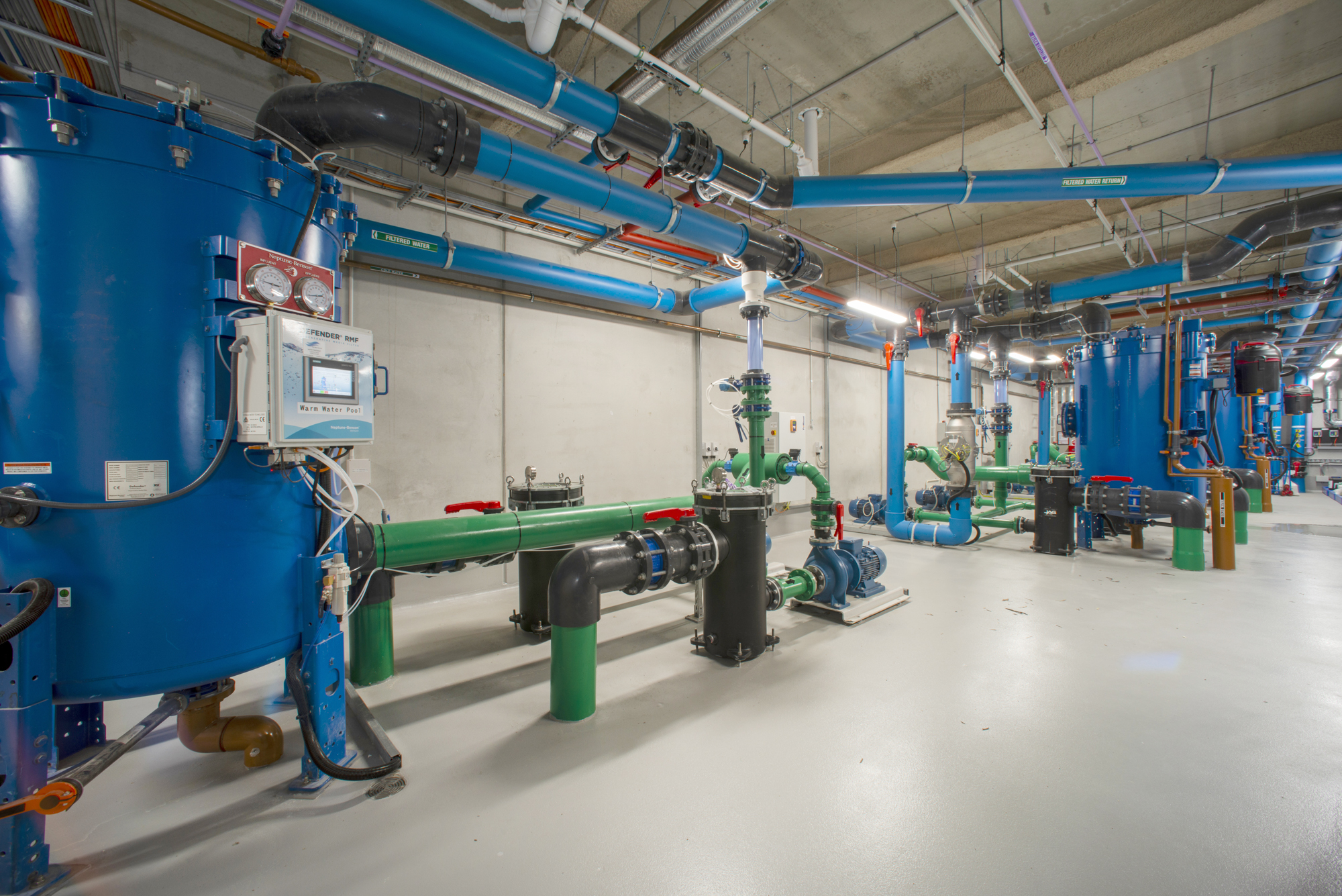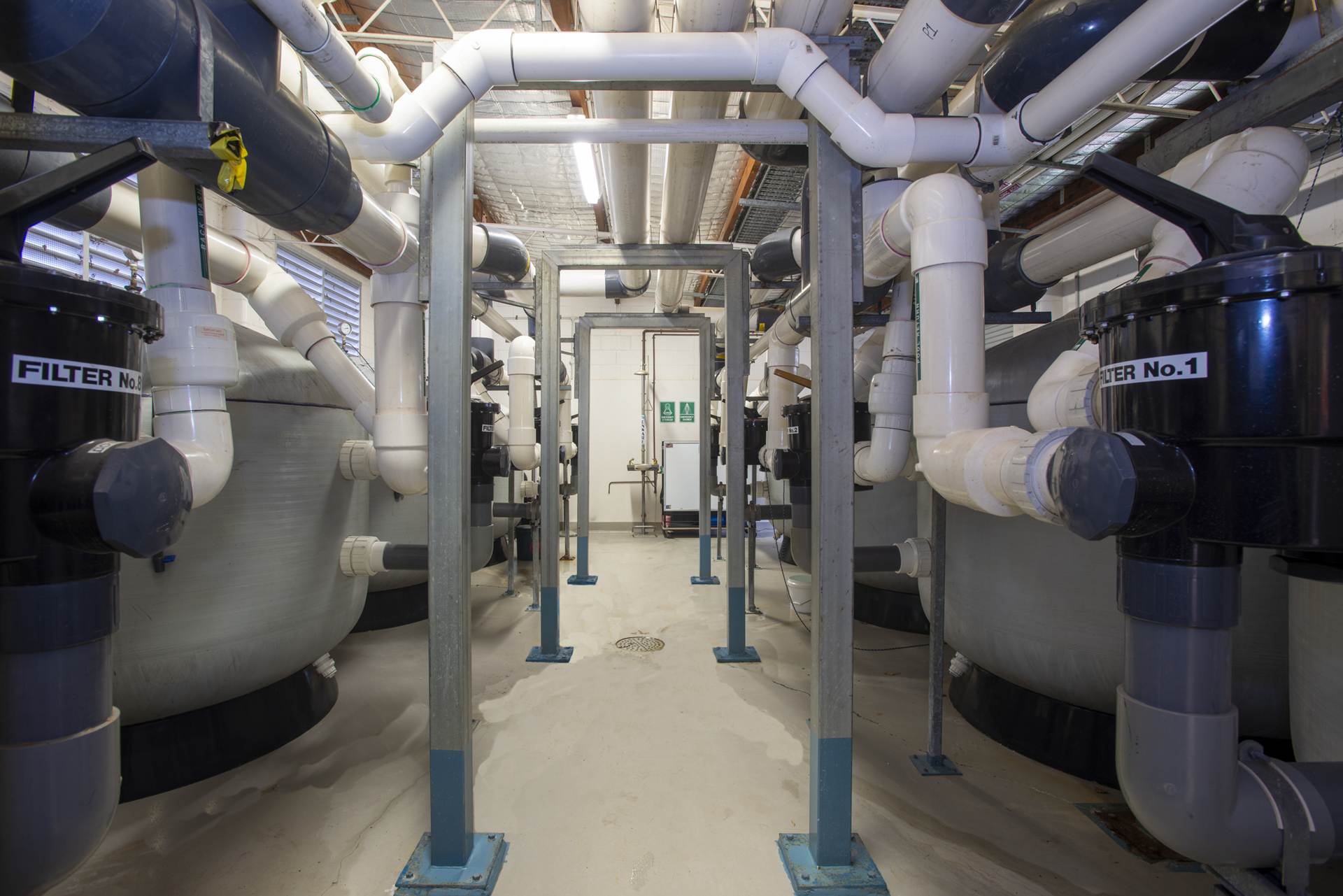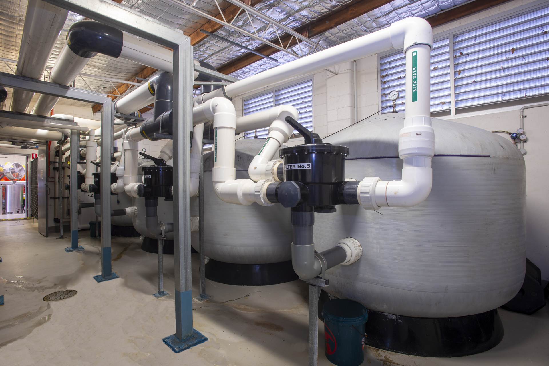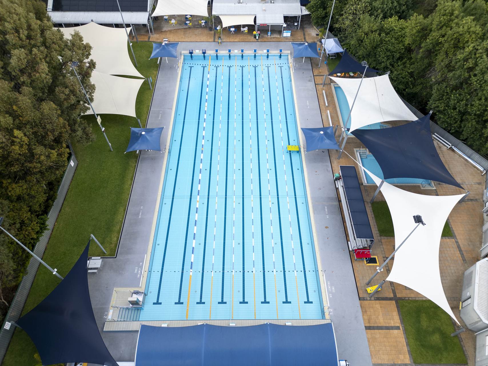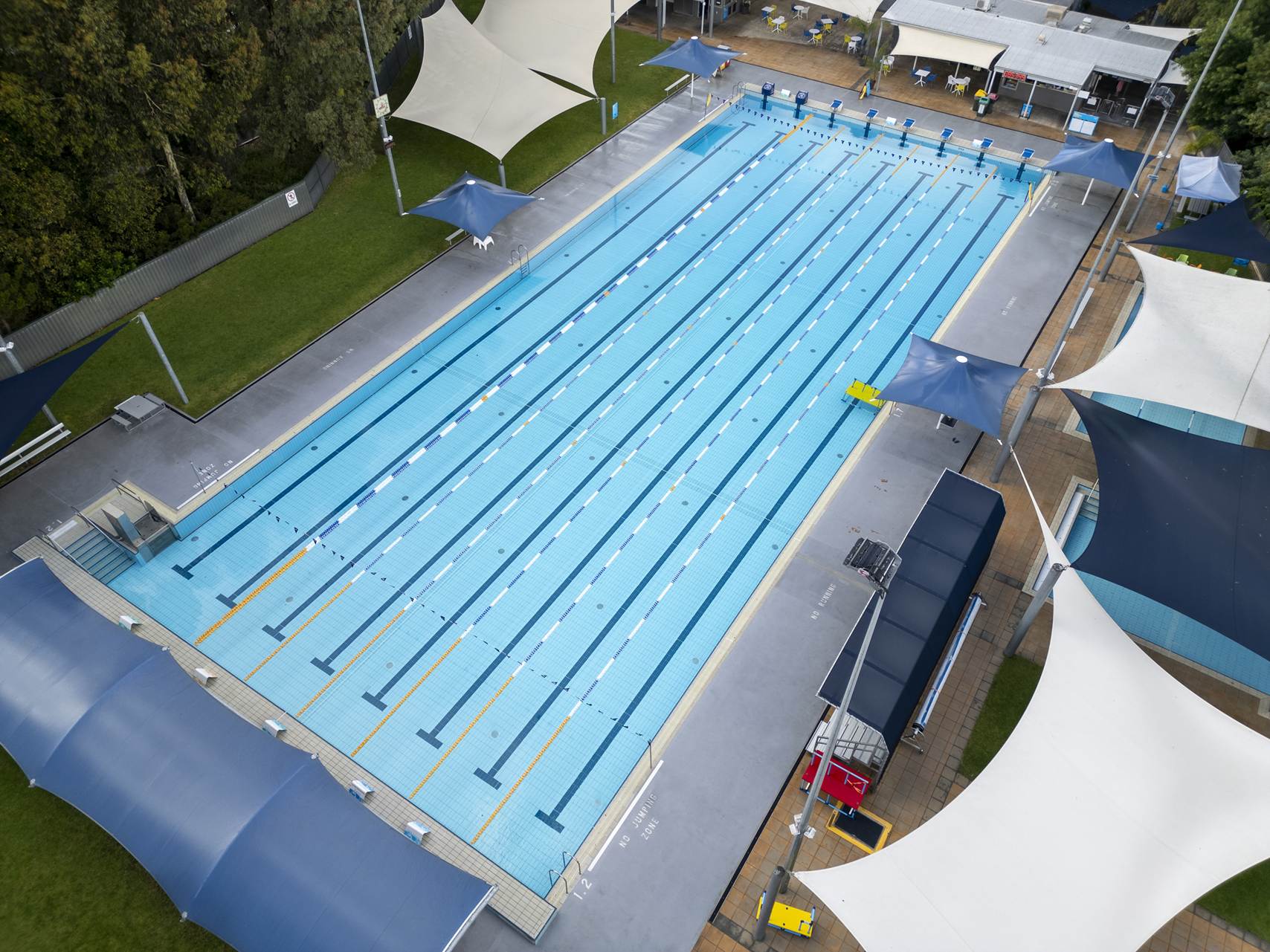 50m x 20m Olympic size pool, 2m to 1m depth, fully tiled using Agrob Buctile commercial tiles, wet edge with balance tank, lane rope anchors and lane ropes, lane rope reels, prominent chemical dosing system with CO2 liquid chlorine & liquid acid, sand filtration, 2 gas heaters, backwash tank, tiled internal steps with stainless steel rails and ll signage to South Australian Health Commission regulations.