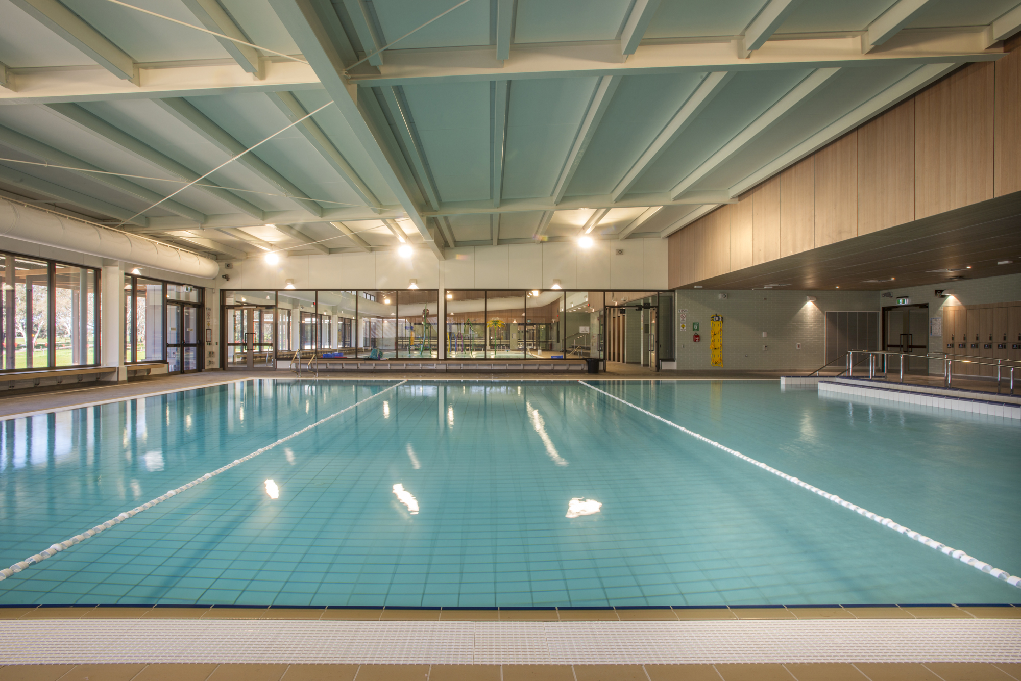 25 metre 8 lane heated pool with kids fun area,splash pad, sauna and recreational area.