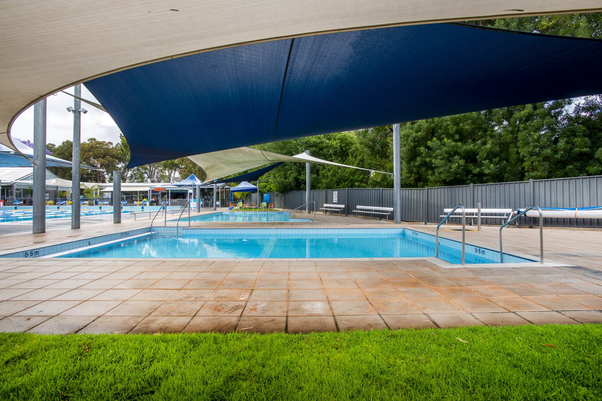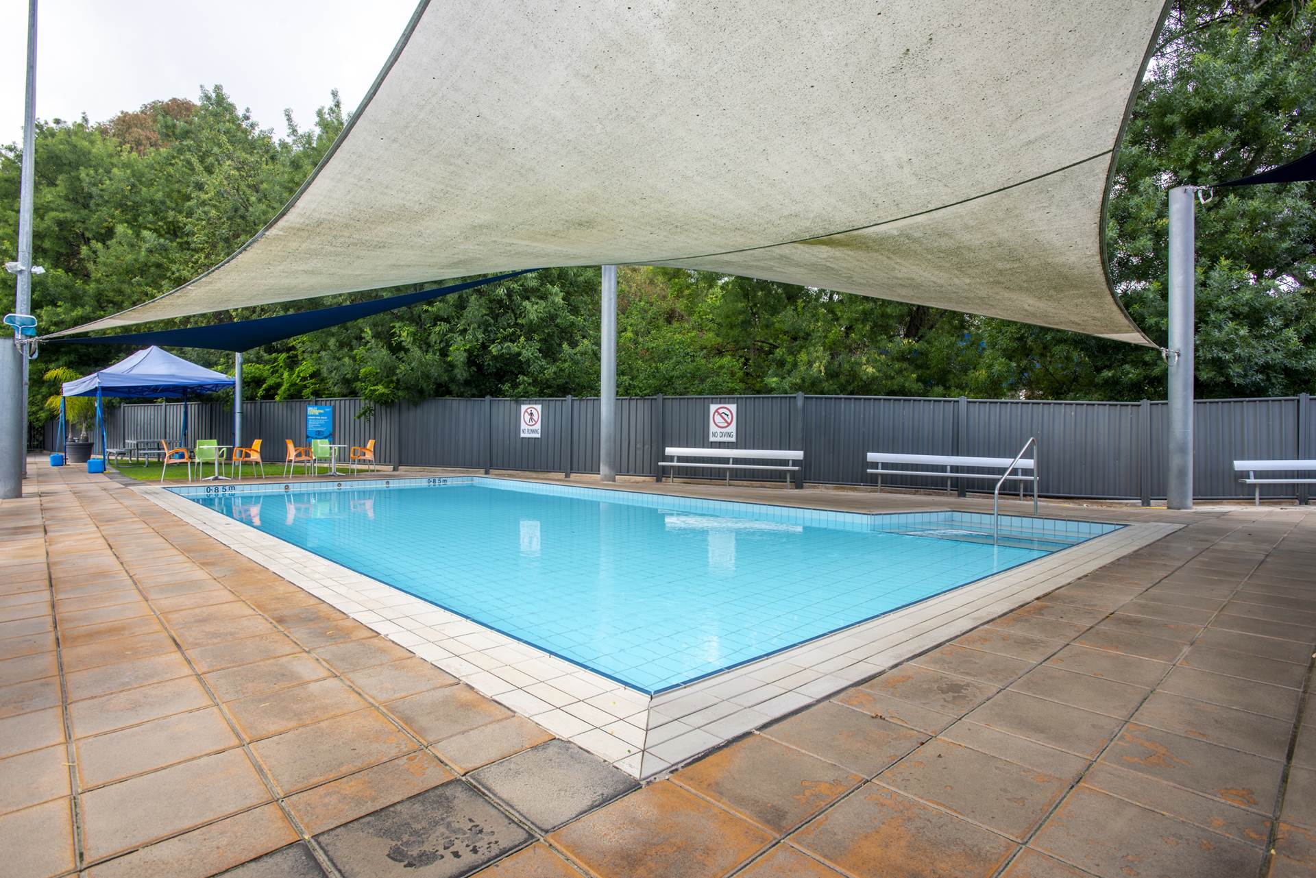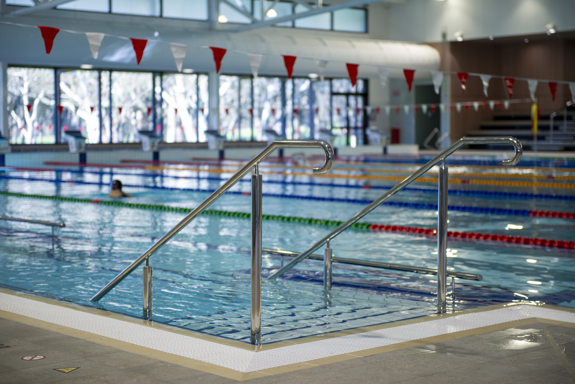 Fully tiled, 25m x 12m with 1.2m constant depth, wet edge, balance tank, sand filtration, automatic liquid chlorine CO2 PH control, lane row bankers and lane ropes, step insert with stainless steel grab rails and all signage to South Australian Health Commission regulations.