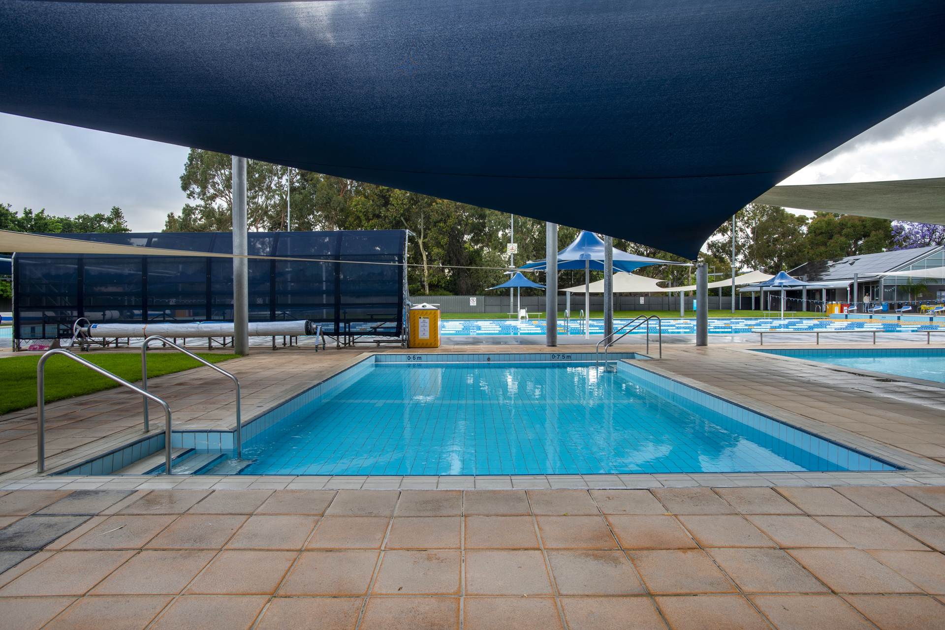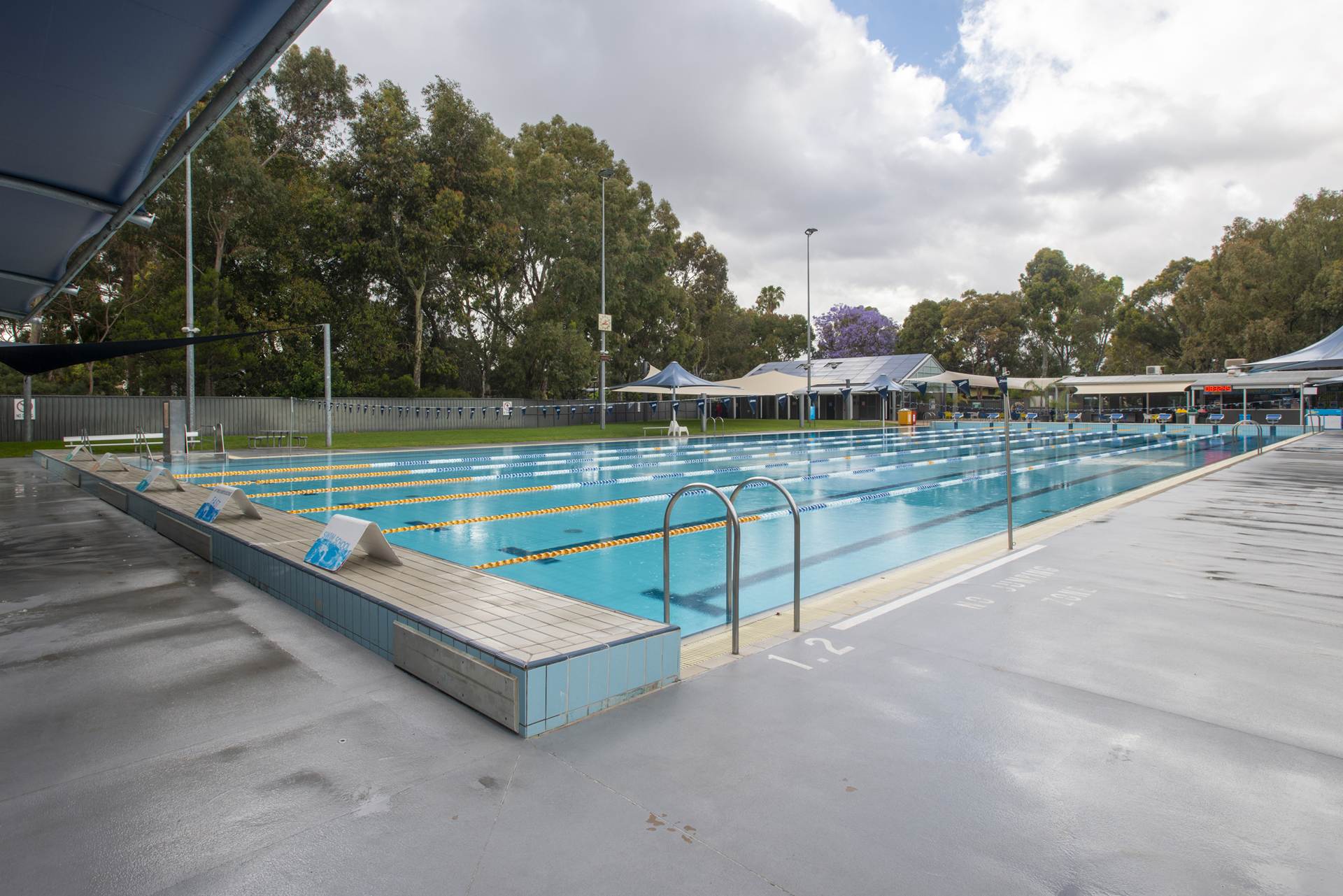 25m x 6m, depth 2.2m to 1.2m, fully tiled pool with Wet edge, automatic chlorination & PH control system, Sand filtration, gas and Solar heating, stainless steel rail and ramp, lane rope anchors and lane ropes and all signage to South Australian Health Commission regulations.
